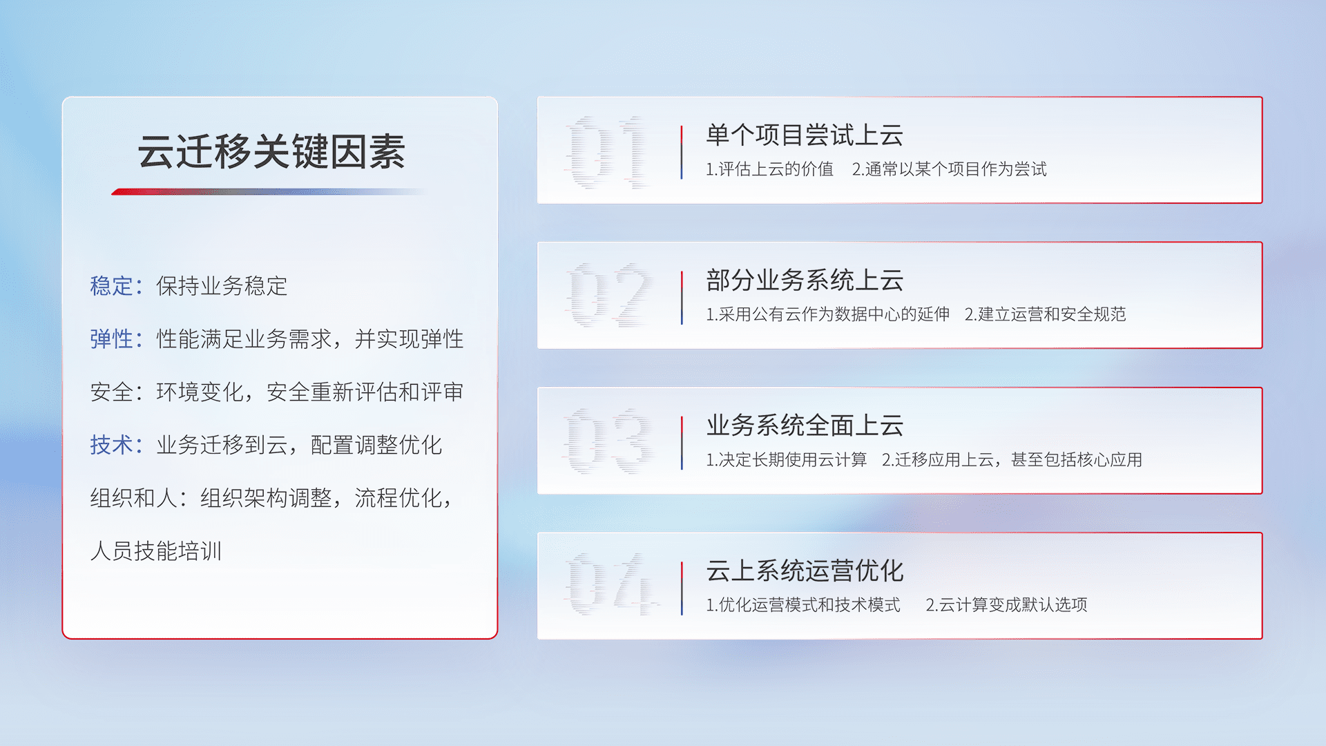 结合实际业务,,,,从规划设计、、、云平台选型、、、、云原生改造、、、数据迁移、、、集成交付,,,,迁移全过程为客户识别最佳上云路径,,做好风险识别管理,,,,设计网络架构、、、、身份权限、、、、安全审计合规、、操作审计、、、日志审计、、、、监控告警策略、、、、多站点容灾设计等,,,,对云上基础设施进行整体规划,,提升IT治理水平,,,,以满足弹性、、、、高可用、、高性能的需求。。
