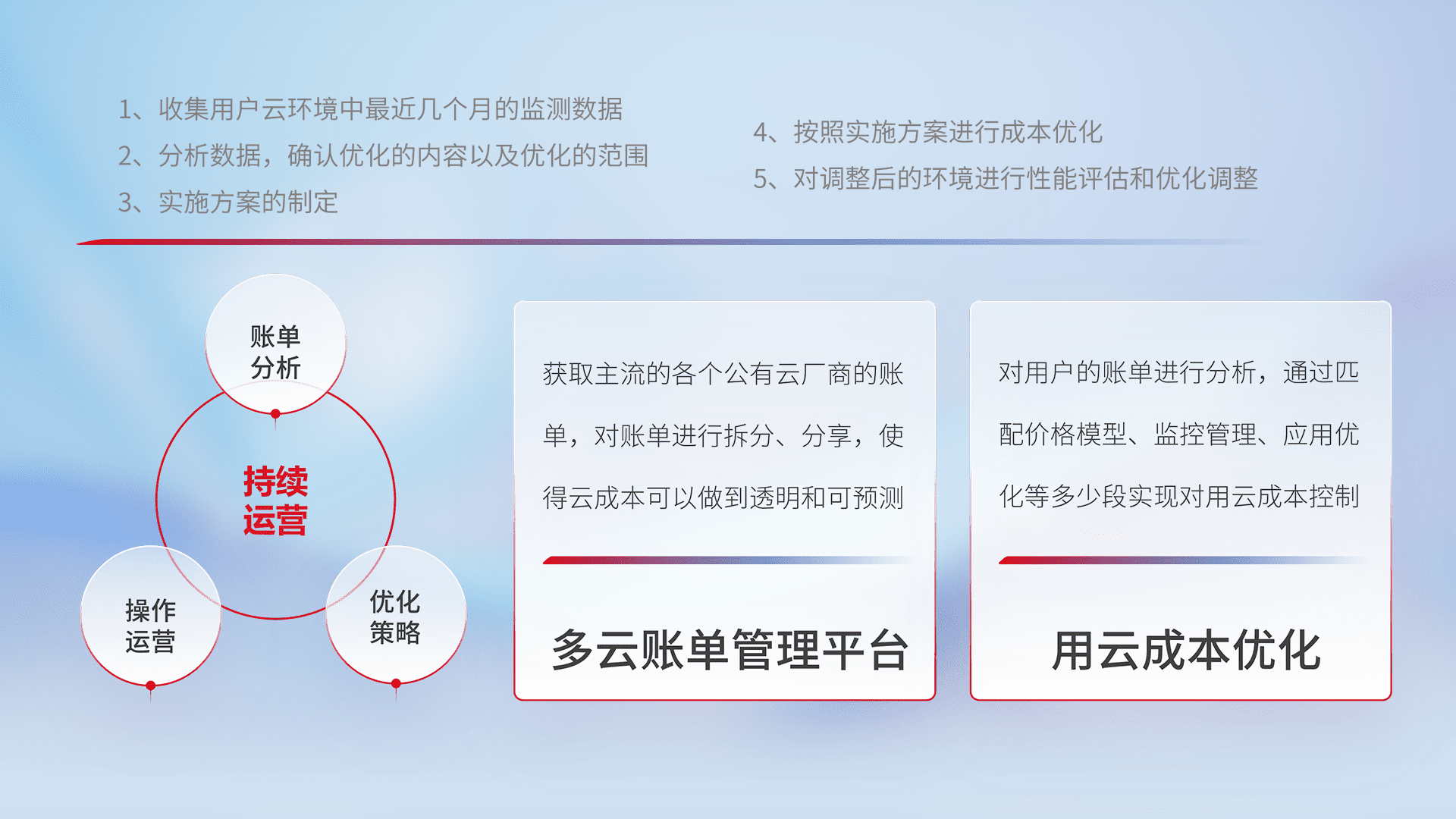 通过多云纳管,,以统一的资源数据模型把客户的云资源进行抽象和封装,,,,进而实现对多云资源的统一操作,,,,保障云资源管理的可靠性、、、、稳定性与可用性。。。量身定制化运维内容,,,配置、、开发运维、、、、补丁管理、、、、备份、、监控、、、认证和访问管理、、、审计和日常巡检等,,保障在用云过程中的可靠度,,,稳定度以及高可用率。。。